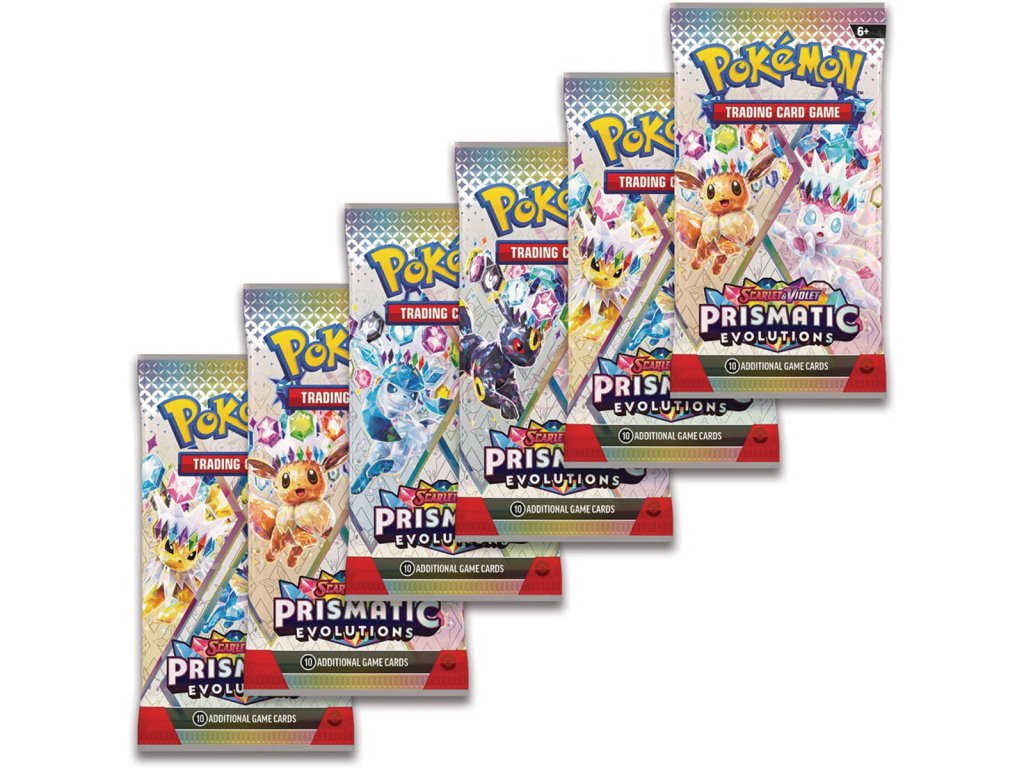 Obsah balení: 6x Pokémon booster (6x 10 náhodných karet) Scarlet & Violet - Prismatic Evolutions, papírová krabička na karty, ve které jsou boostery uloženy