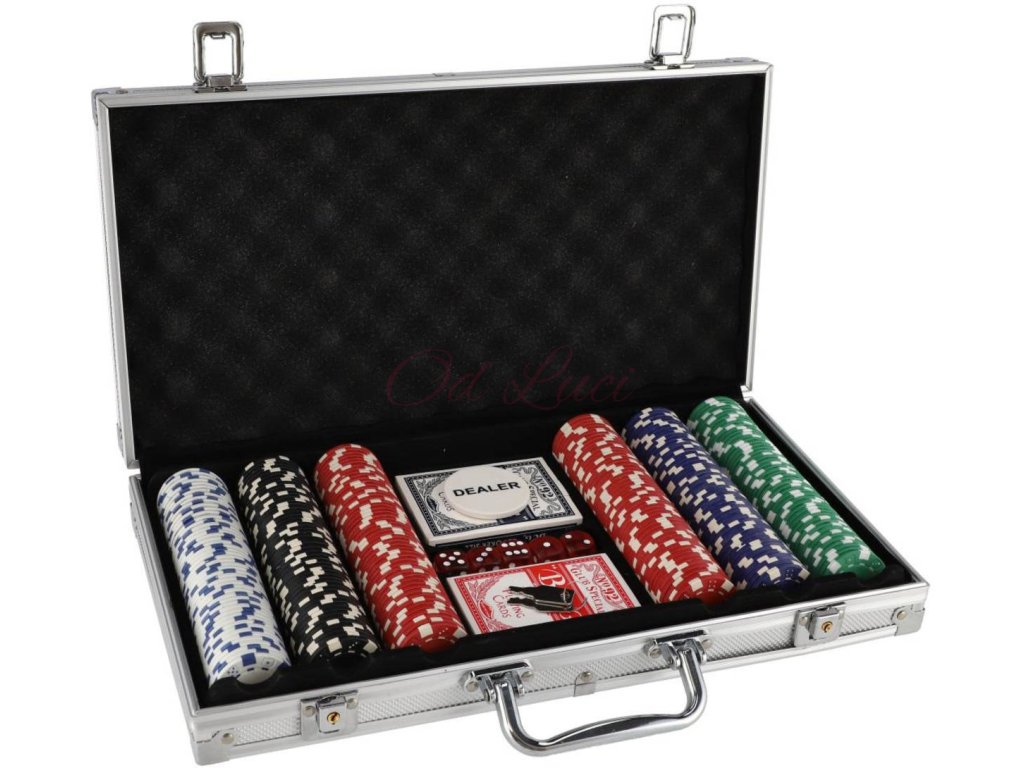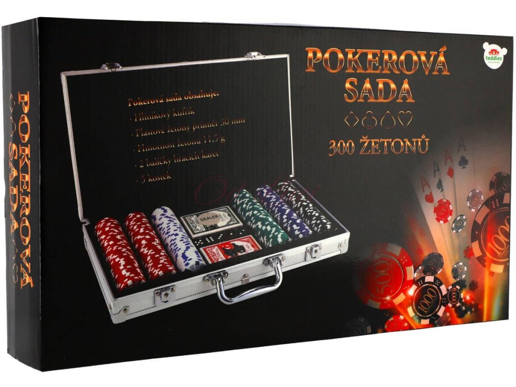 Sada pro hru Poker v kovovém kufříku. Součástí 300 žetonů, 2 balíčky karet a hrací kostky. Určeno pro dospělé.