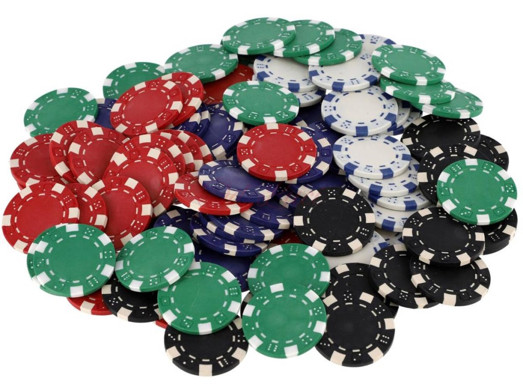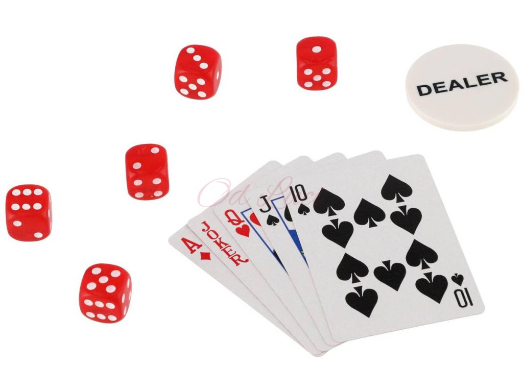 Obsah balení: žetony (300ks, průměr 30mm, hmotnost 11,5g), 2 balíčky karet, 5 hracích kostek