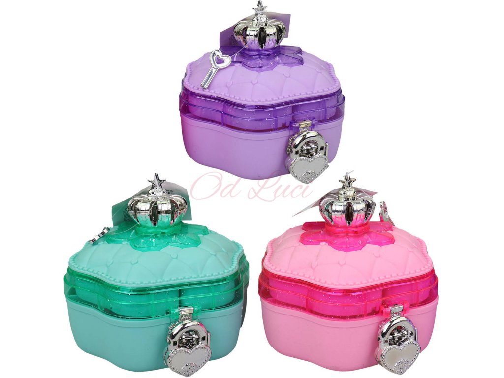 Hrací plastová skříňka 13cm s melodií, se stříbrným zámkem, klíčkem a korunkou, pro všechny malé princezny. 3 barevné varianty. Hračka na baterie, se světlem a zvukem.