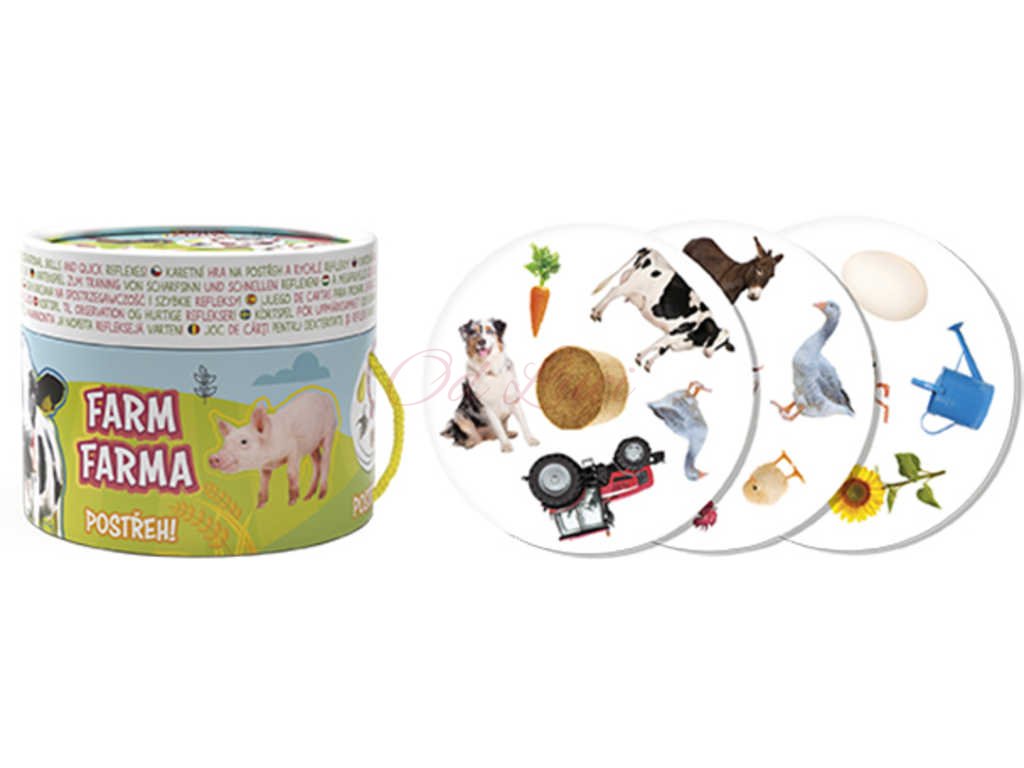 Karetní hra na postřeh a rychlé reflexy obsahuje 30 barevných kartiček ke hraní v tubě a obrázky k vybarvení s oblíbeným motivem farmy. Součástí balení jsou i pravidla, jak si hru zahrát.