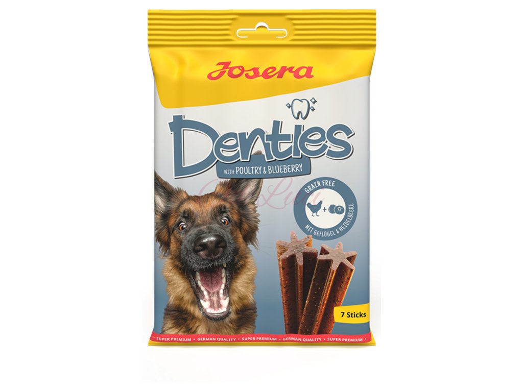 Psi mají silný přirozený instinkt žvýkat. Toho lze velmi dobře využít k podpoře každodenní péče o ústní dutinu: Josera Denties s drůbežím a borůvkami mají důmyslnou hvězdicovitou strukturu, která může při intenzivním žvýkání přispět k redukci nepříjemného plaku. Obsažená celulóza může tento účinek dokonce podporovat. Josera Denties s drůbeží & borůvkou jsou nejen vhodné pro ústní hygienu, ale také lahodně chutnají po drůbeži. Recepturu doplňuje borůvkové pyré, které žvýkacím tyčinkám dodává ovocný nádech. Chutné žvýkací tyčinky jsou zcela bez obilovin - pro vysokou snášenlivost.