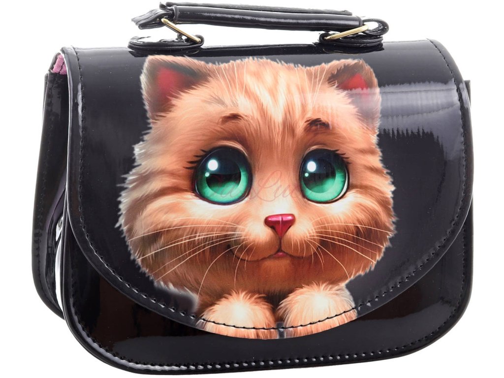 Lesklá holčičí lakovaná kabelka o velikosti 18 x 14cm, s popruhem přes rameno, s motivem Kočka.