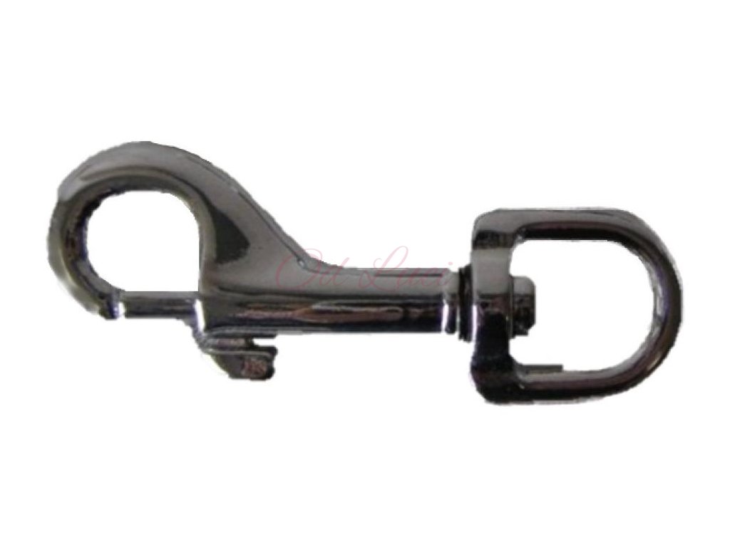 Klasická háková karabina s otočně uloženým půlkulatým okem pro připevnění k vodítku.