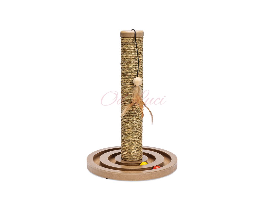 Další dřevěná koule je připevněna na laně v horní části sloupu jako pohyblivá hračka. Tento herní prvek je navíc vybaven peřím, aby upoutal zájem kočky.