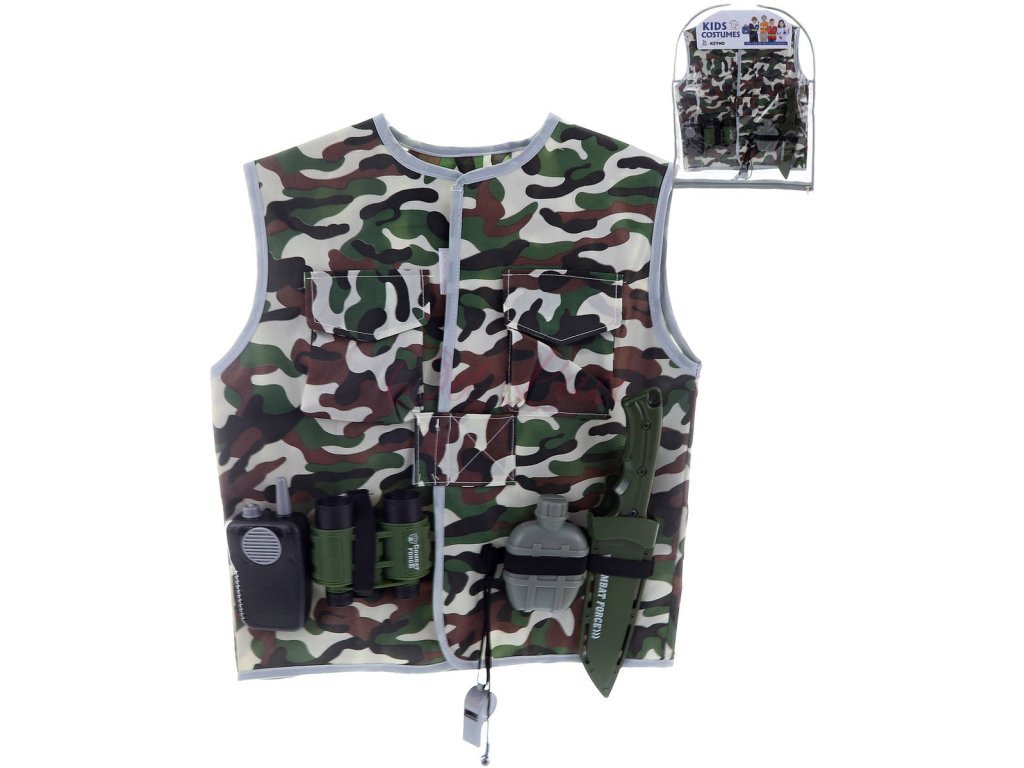 Dětský vojenský herní set. Vhodné i jako kostým Voják, na karneval. Součástí maskáčová vesta, vysílačka, dalekohled, nůž v pouzdře a další doplňky.