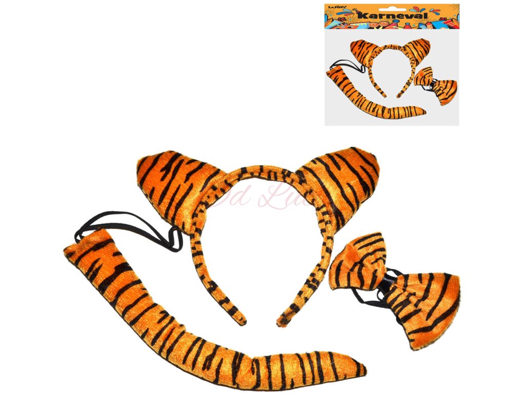 Tygr - Kostýmové doplňky k obleku na karneval, které z vás švihem vykouzlí zvířátko. Součástí čelenka s ušima, mašlička a ocásek.