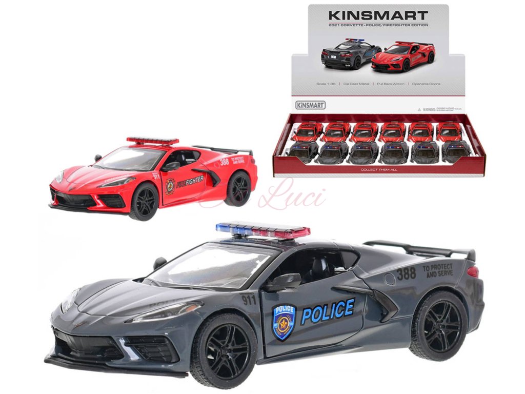 KINSMART KT5432DPR - CORVETTE 2021: Krásný věrný kovový model (detailní kopie) - dětský kovový sportovní vůz záchranných složek z kovu a plastu, ve dvou variantách provedení. Autíčko má otevírací dveře (dvířka jdou otevírat), s plastovým spodkem. Vůz vyroben tlakovým litím z kovové slitiny v kombinaci s plastovými díly. Na zpětné natažení - pull-back