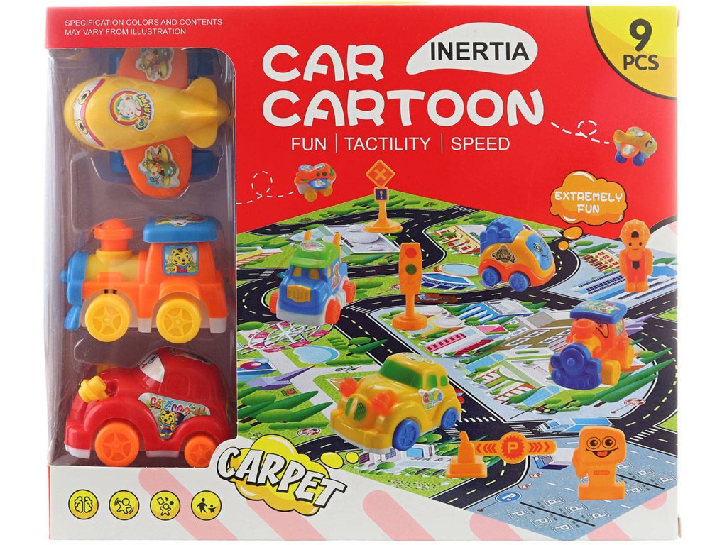 Obsah balení: koberec, auto, lokomotiva, letadlo, dopravní značení, panáček