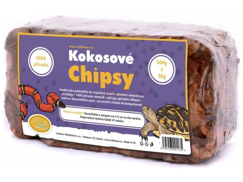 Použití: kokosové chipsy mají univerzální použití v polovlhkých i vlhkých teráriích, díky své jemnosti a čistotě se hodí jako podklad pod většinu terarijních zvířat. Dále se skvěle hodí jako příměs do zahradnických substrátů, například pro orchideje a epifytní rostliny. Smícháním ze zeminou, případně dalšími materiály, se vytvoří lehký pěstební substrát s vysokou schopností udržet vlhkost.