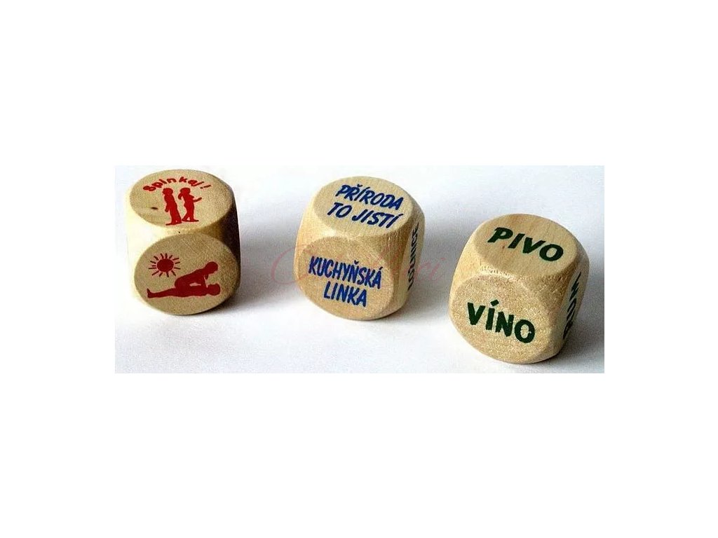 Dřevěné kostky - první vám ukáže jakou polohu vyzkoušíte, druhá kde to budete dělat a třetí co si k tomu dáte k pití.Kostky velké 2,5 x 2,5cm.