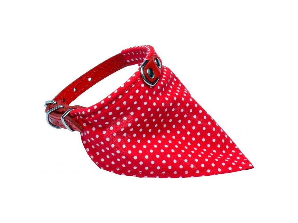 Hladký kožený obojek je vyroben z kvalitní kůže, pro pevnost je obšitý nití do barvy. Je vybaven svařovanými déčky, tak dosahuje maximální pevnosti. Jeho ozdobou je bavlněný šátek v různém designu.