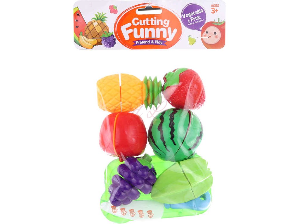 Dětská plastová napodobenina krájecího ovoce na suchý zip s příslušenstvím, v sáčku. Jednotlivé dílky jsou spojeny suchým zipem a je možné je jednoduše "krájet" přiloženým nožíkem. Poloviny,