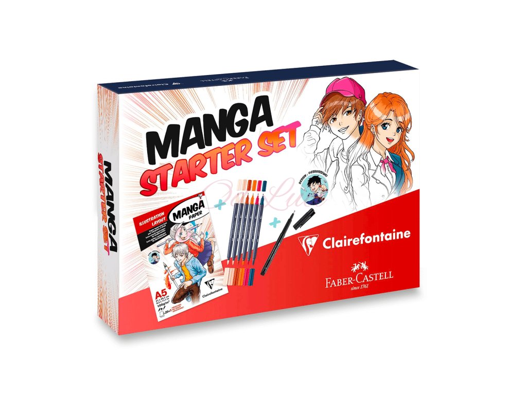 Kreativní sada Clairefontaine Manga Starter Set navržená ve spolupráci se značkou Faber-Castell obsahuje veškeré materiály, které potřebujete k naučení se kreslení a vybarvování mangy lihovými fixy.