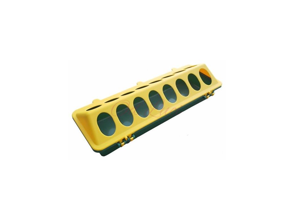 Plastové krmítko pro kuřata a malá plemena slepic s otvory pro jednu hlavičku, takže se drůbež netlačí na sebe a nemohou si ublížit.