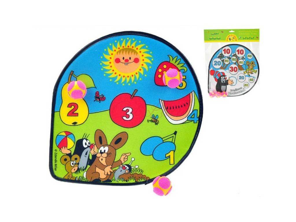 Terč Krteček na suchý zip obsahuje 3 míčky, suchý zip a terč k zavěšení.