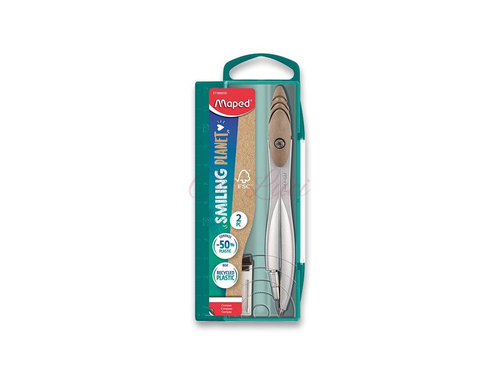 Kovové kružítko Maped Smiling Planet Study s ergonomickým úchopem, který je vyroben z 50% směsi dřevního vlákna s certifikací FSC. Pouzdro kružítka je z recyklovaného plastu s integrovaným pravítkem.