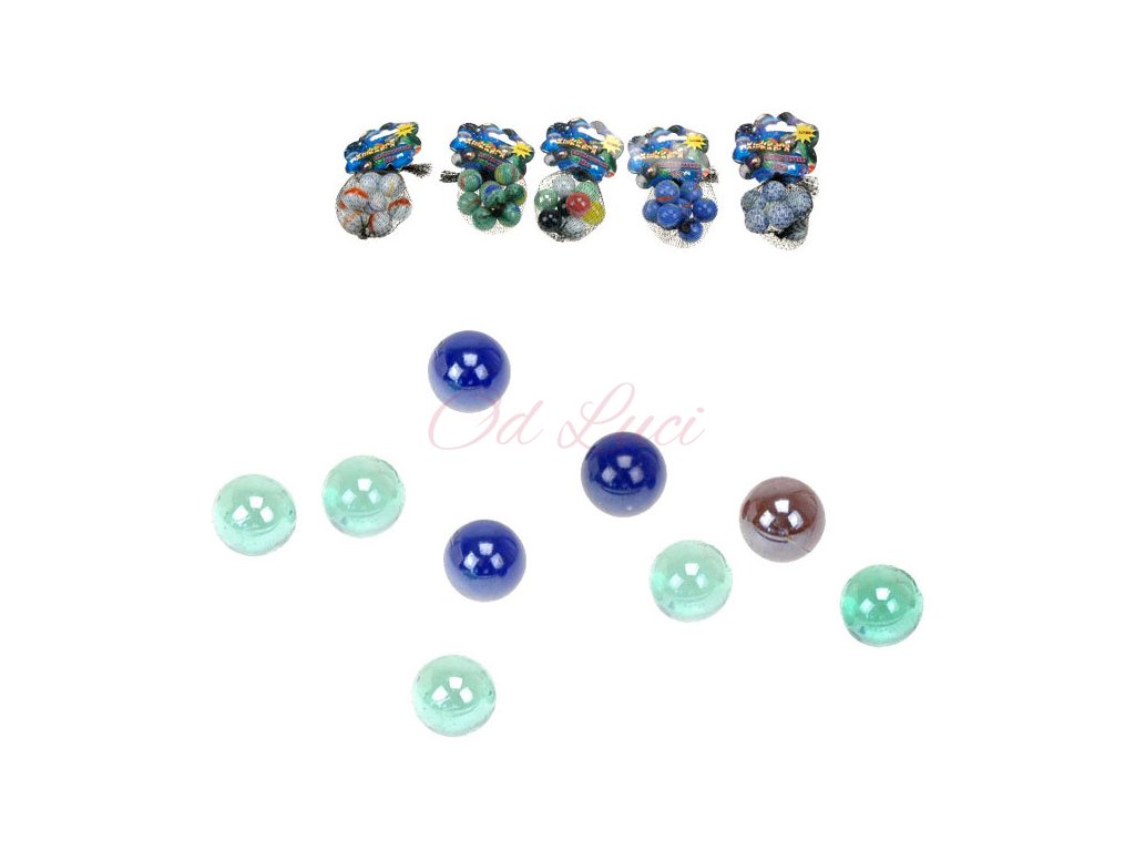 Sada osmi kuliček ze skla v pěti barevných mixech, v síťce.
