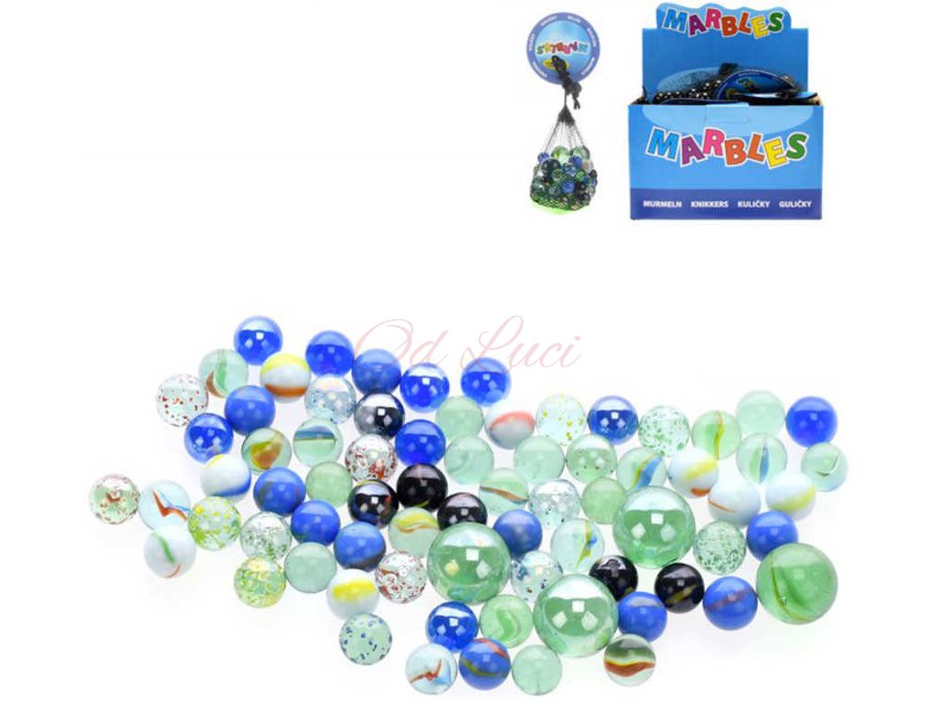 Velká sada 40ti kusů skleněných kuliček na cvrnkání, v několika variantách provedení. Balení obsahuje vždy dvě kuličky ve větší velikosti. Baleno v sáčku.