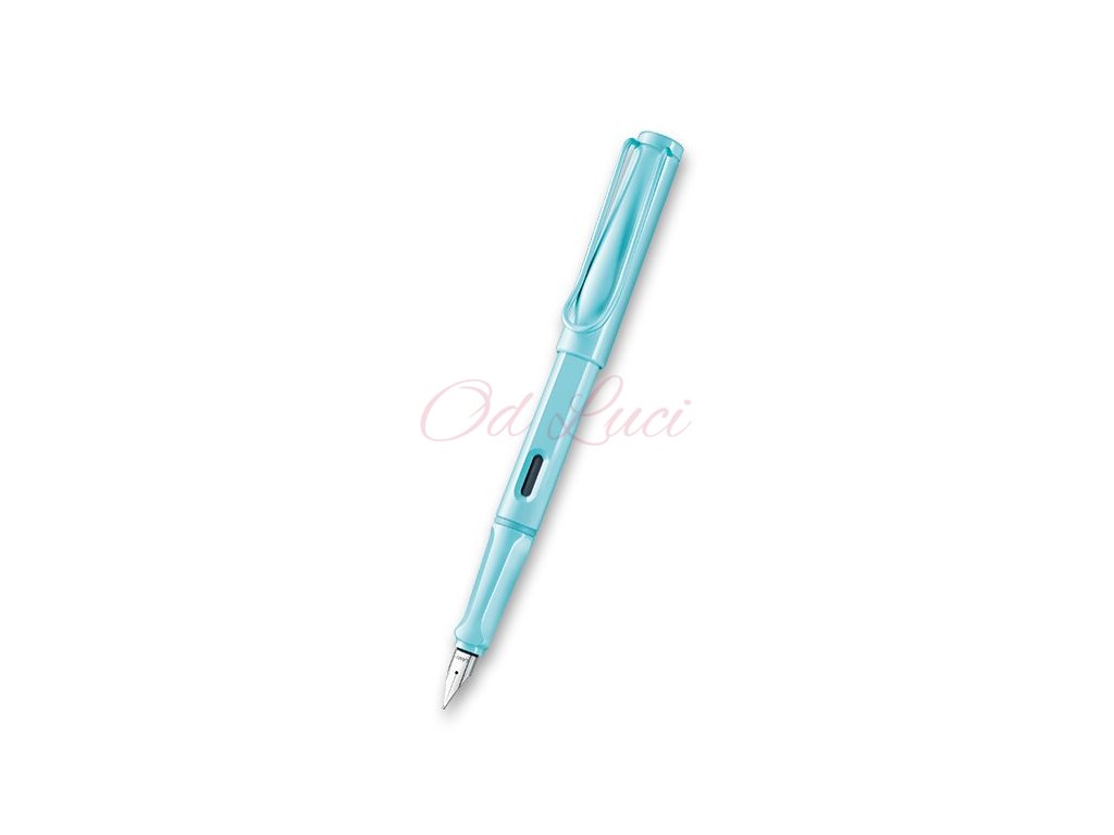 Plnicí pero Lamy Safari v provedení Aquasky má tělo z tvrzeného ABS plastu, nasazovací víčko a odpružený kovový klip. Úchopová zóna je ergonomicky upravená, hrot je z nerezové oceli.