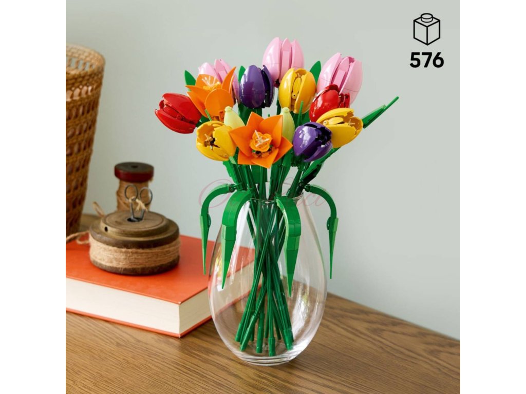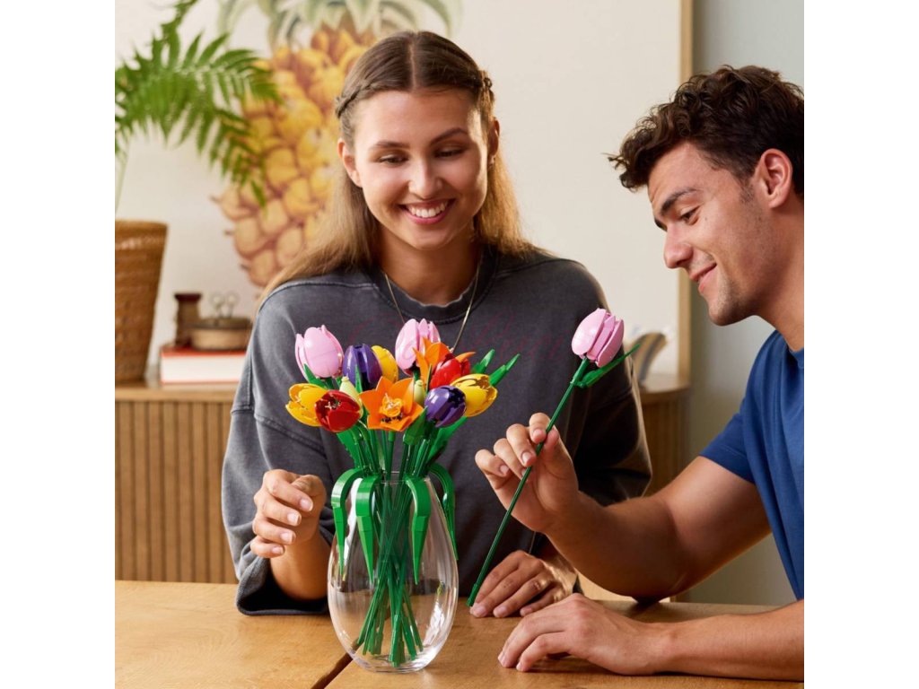 5 TULIPÁNŮ LEGO® – Kytice obsahuje 5 druhů tulipánů v různých barvách a fázích rozkvětu: součástí jsou zelená poupata, fialové uzavřené tulipány a červené, žluté a růžové rozkvetlé tulipány