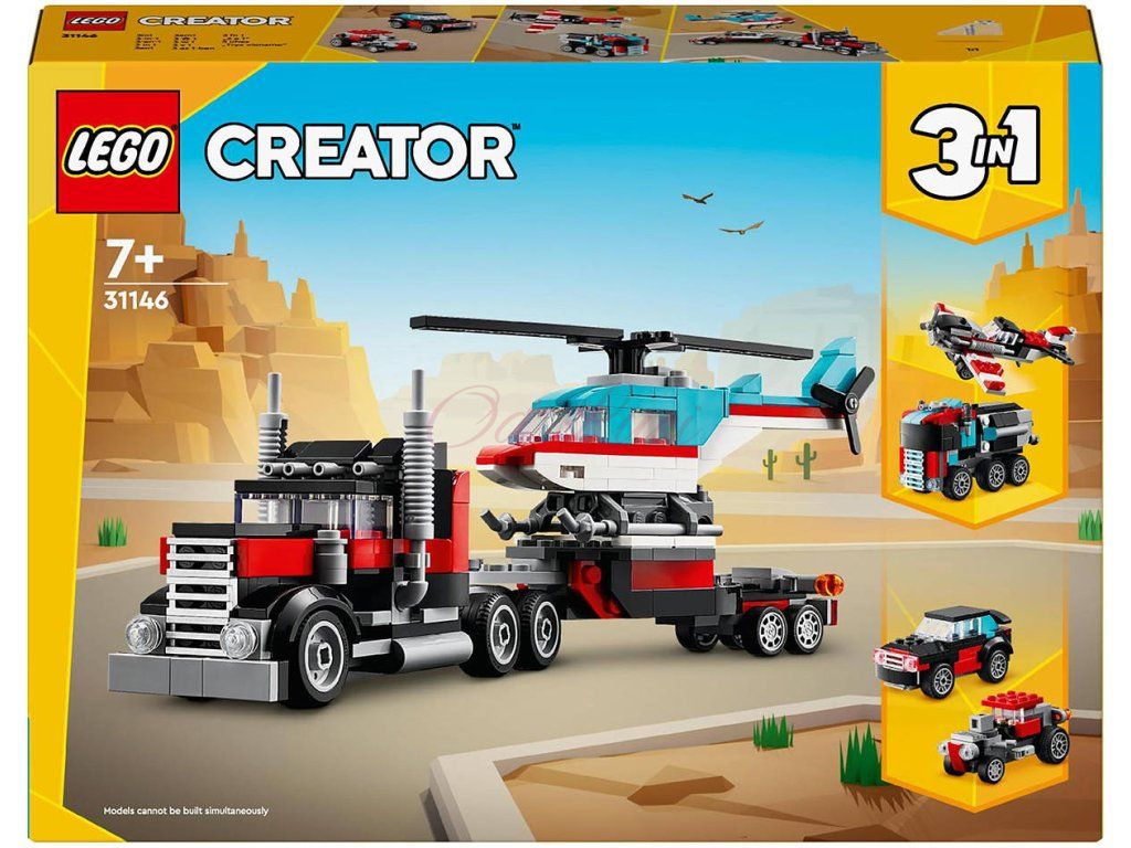 Děti od 7 let se se stavebnicí Náklaďák s plochou korbou a helikoptéra pustí do akčního hraní. Sada se skládá z 270 dílků, ze kterých si malí stavitelé postaví parádní náklaďák s otáčecími koly a korbou, na které přistane helikoptéra LEGO s pohyblivou vrtulí. Malí stavitelé si s touto stavebnicí z řady LEGO Creator 3 v 1 poskládají hned 3 různé dvojice modelů. Nejprve si postaví třeba náklaďák s plochou korbou a helikoptéru, pak modely přestaví na vrtulové letadlo a náklaďák s palivem s otáčecími koly a pak se vydají na závody s modely hot rodu a SUV – nebo si postaví vlastní originální vozidla.