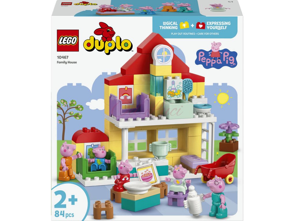 Batolata si můžou hrát na každodenní činnosti se svými oblíbenými televizními postavičkami se stavebnicí Prasátko Peppa: Rodinný dům. Tento dárek pro děti od 2 let obsahuje celou pětičlennou rodinu Prasátka Peppy, včetně prasátka Evie. Stejně jako v seriálu má i tento dvoupatrový domeček LEGO DUPLO oddělené pokoje pro Toma a Prasátko Peppu, kuchyň, koupelnu a obývací pokoj. S touto hračkou na hraní rolí si malé děti připomenou scény ze seriálu a zahrají na každodenní situace známé z vlastního domova, jako je uspávání nebo rodinná snídaně. Stavebnice obsahuje 5 figurek LEGO DUPLO – maminku, tatínka, Toma, Evie a Peppu – a pomáhá dětem rozvíjet emoční inteligenci při hraní na to, že mají nového člena rodiny. Tato vzdělávací hračkapro batolata je plná doplňků pro hru plnou kreativity a umožňuje malým stavitelům představit si péči o miminko včetně procházky v kočárku, krmení z láhve nebo koupání.