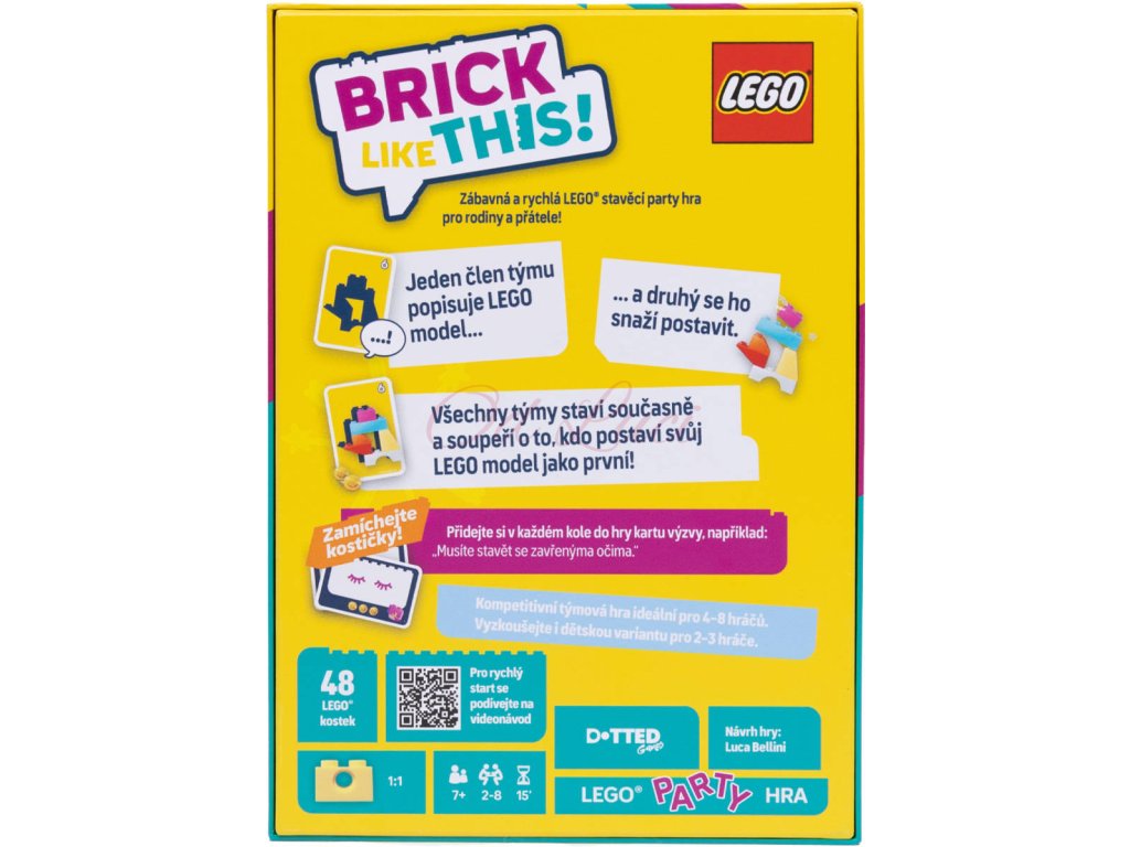 Ve hře Brick Like This! soupeří týmy ve skládaní modelů z LEGO® kostek. Vítězí tým, který po šesti kolech získá nejvíce bodů! Jeden člen týmu popisuje LEGO model a druhý se ho snaží postavit. Všechny týmy staví současně a soupeří o to, kdo postaví svůj model jako první. Přidejte si v každém kole do hry kartu výzvy, například: "Musíte stavět se zavřenýma očima." Kompetitivní týmová hra ideální pro 2-8 hráčů. Vyzkoušejte i dětskou variantu pro 2-3 hráče.