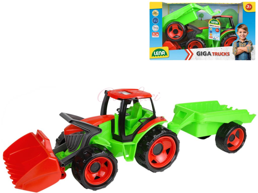 Kvalitní plastový traktor LENA GIGA TRUCKS s čelním nakladačem a vlečkou, na písek. Moderní, detailní design, přívěs, velká lopata, posuvná střecha v kabině řidiče, ergonomicky tvarované rukojeti.