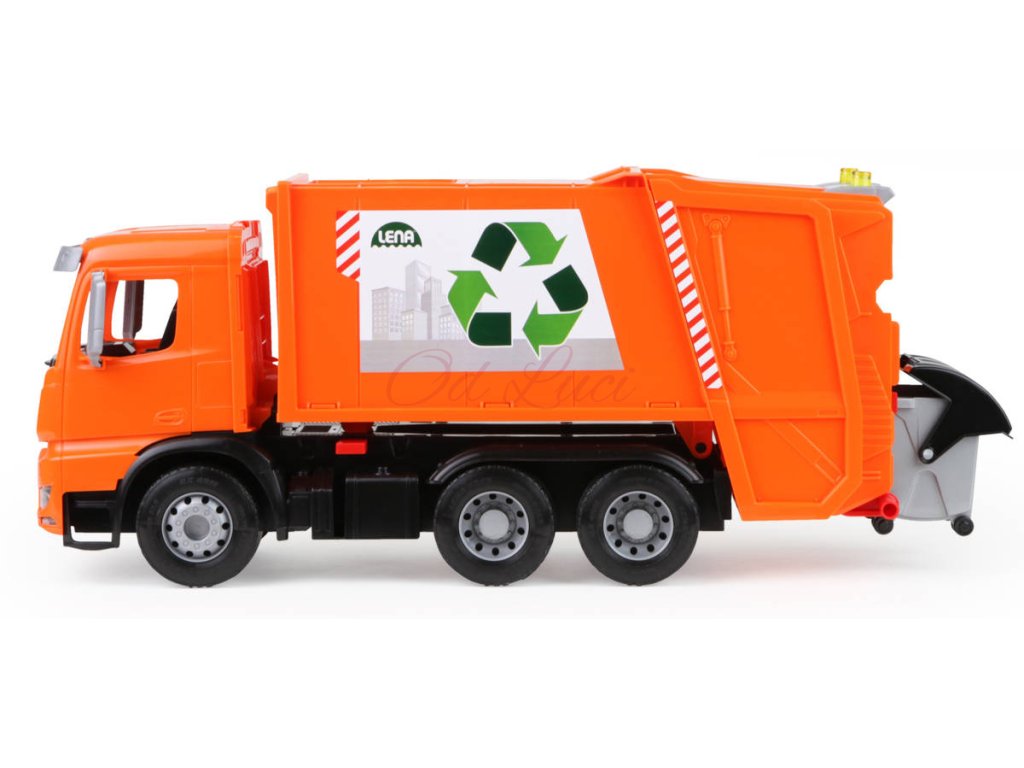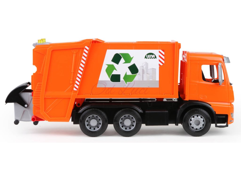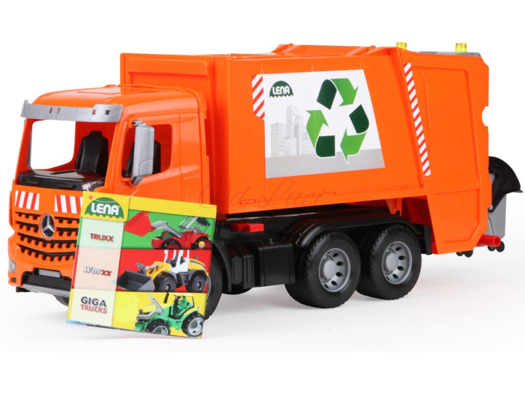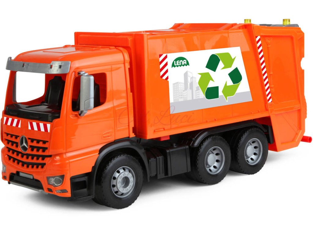 Popelářský vůz Mercedes-Benz Acrocs z řady Lena Worxx. Kvalitní plast, funkční části, pevná konstrukce, součástí 2 popelnice, bez kartonu, velikost 52cm