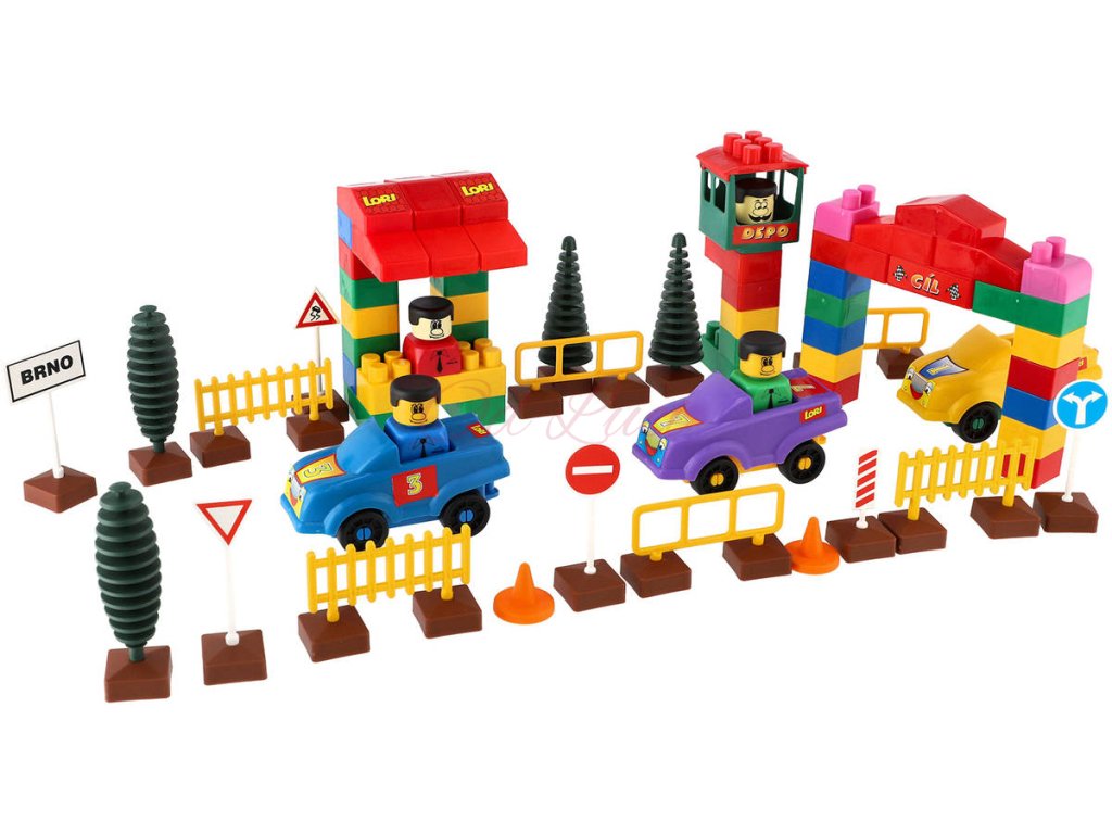 Stavebnice LORI - 9 - Kostky, autíčka,značky,panáčci, stromečky, samolepky a jiné doplňky.