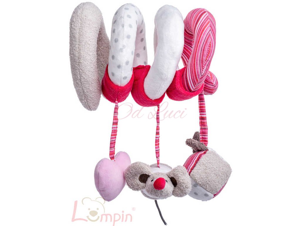 Plyšová spirála, kterou můžete namotat na madlo kočárku, na ohrádku dětské postýlky nebo kamkoliv, kde je třeba zabavit vaše dítě. Na spirále jsou umístěny hračky, které v sobě mají chrastítka a pískátko.