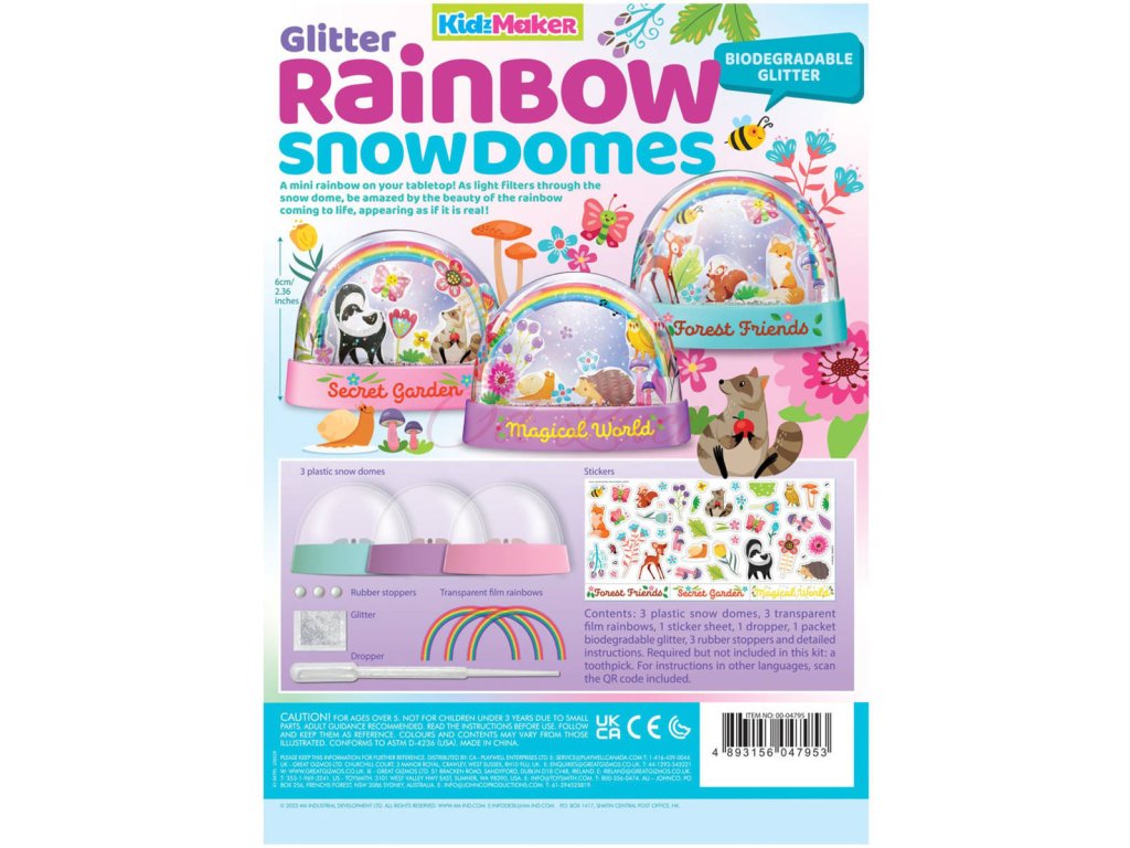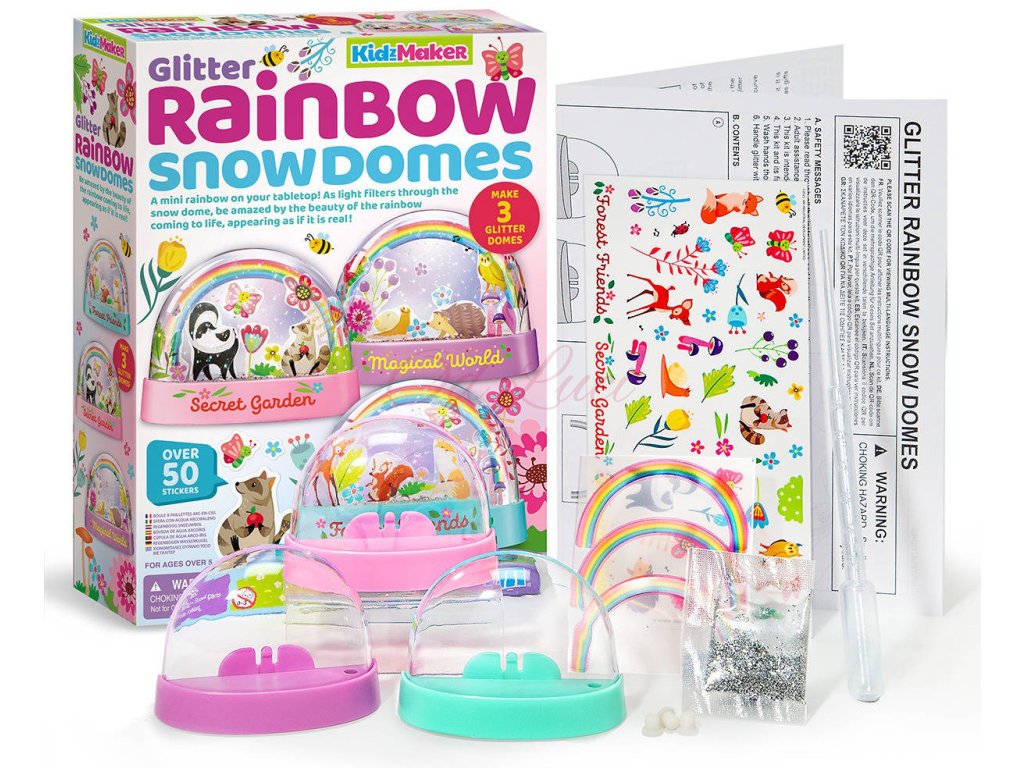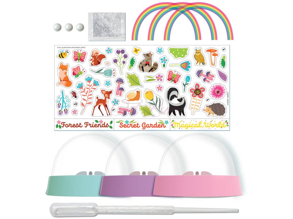 Obsah balení: 3 plastové sněhové koule, 3 průhledné fóliové duhy, arch samolepek, kapátko, balíček biologicky rozložitelného třpytu, 3 gumové zátky, podrobný návod