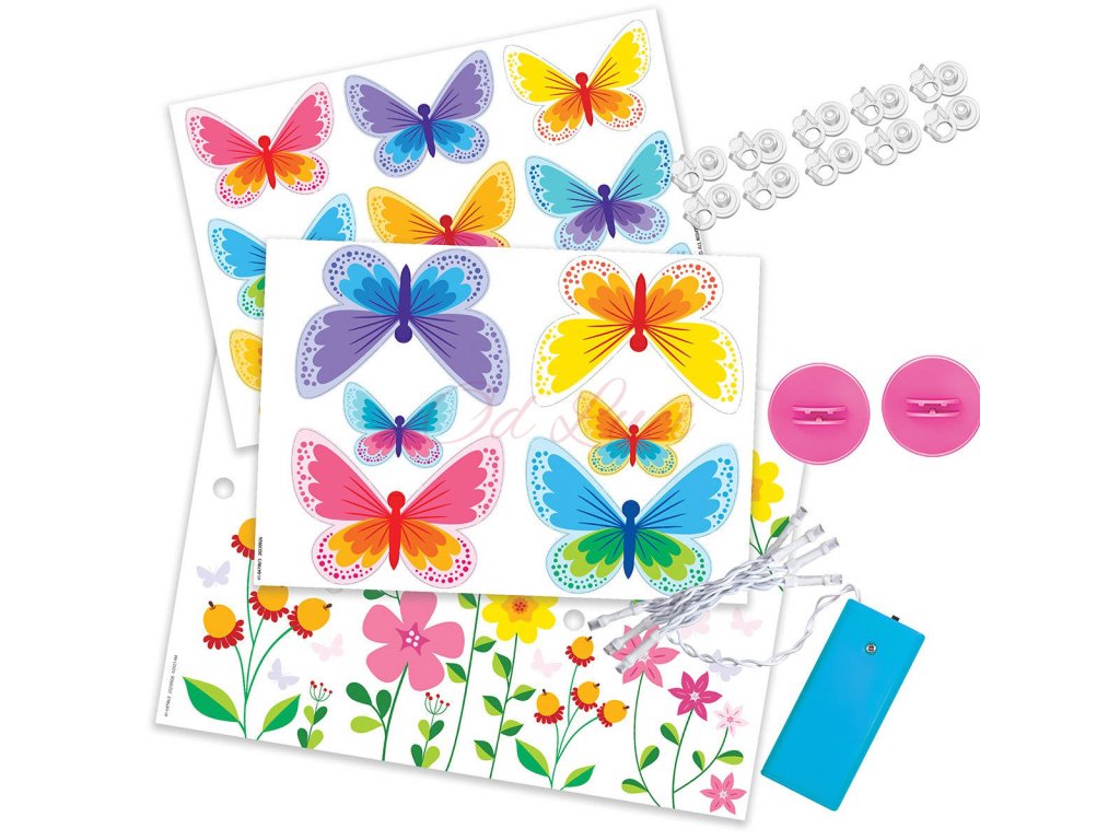 Sada obsahuje: světelnou desku ve tvaru motýla, LED světelný řetěz, 2 stojany, různé šablony motýlů a lepicí pěny, spolu s podrobným návodem pro snadnou montáž a kreativní zábavu
