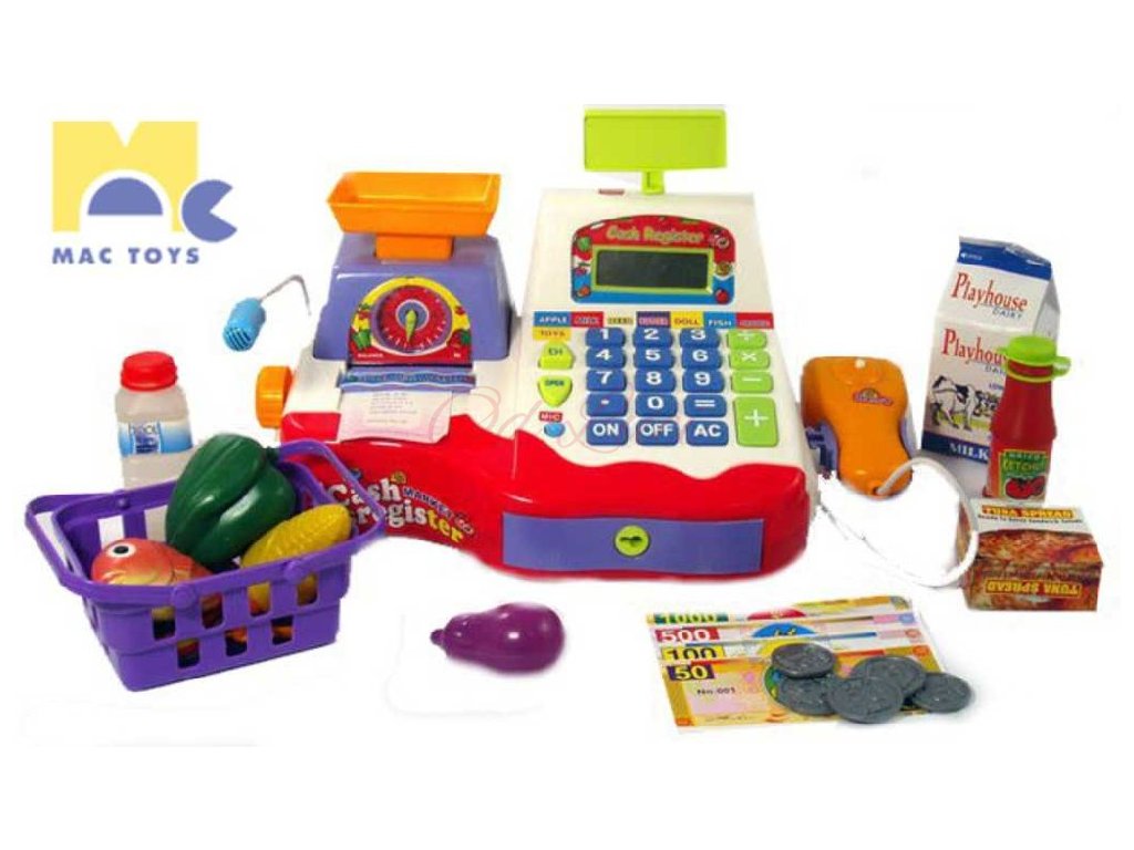 Registrační pokladna s váhou, se zásuvkou, funkční kalkulačkou, mikrofonem a spoustou dalších předmětů pro malé obchodníky.Pokladna svítí a vydává realistické zvuky. Funkční display. Součástí balení je nákupní košík se zbožím a peníze.