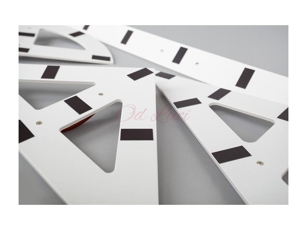 Sada magnetického příslušenství ke školním tabulím. Set obsahuje: trojúhelník s úhlem 60°, trojúhelník s úhlem 45°, pravítko 100 cm, úhloměr a kružítko s magnetickou hlavou