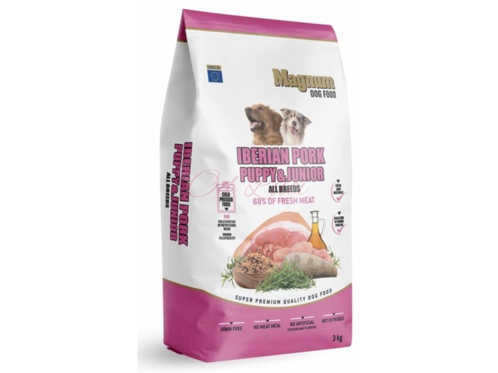 Krmivo Magnum Iberian Pork Puppy & Junior je vyrobeno bez masových mouček pouze z čerstvého Iberského vepřového masa, Atlantické ryby a drůbežího masa z volného chovu, bez lepku a bez přidaných tuků. Důležitým faktorem je, že krmivo není extrudováno.