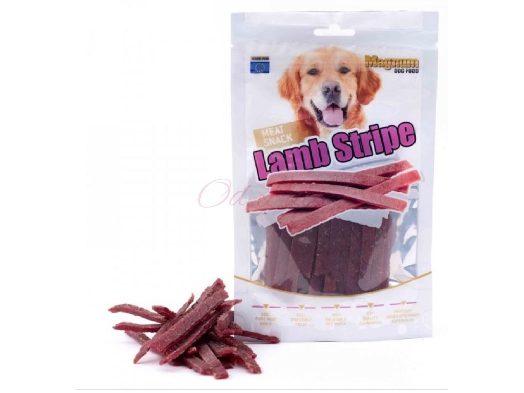 Měkká, přírodní masová pochoutka pro psy s jehněčím masem formovaná do měkkých proužků