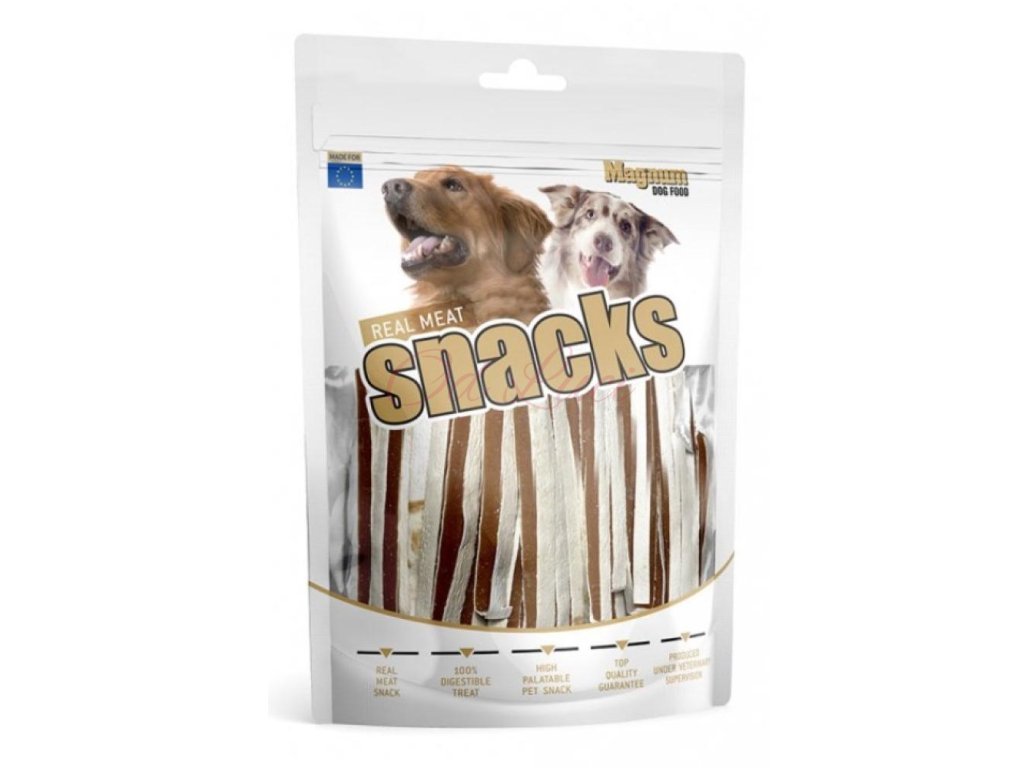 Měkká, přírodní masová pochoutka pro psy. Kuřecí a rybí maso formované do měkkých proužků, které se snadno dělí na menší kousky. Slouží jako odměna při hře, výcviku nebo jako doplněk stravy při cestách.