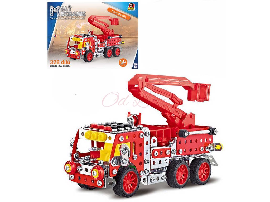 MALÝ MECHANIK Hasičský vůz 327 dílků kovová STAVEBNICE typu Merkur
