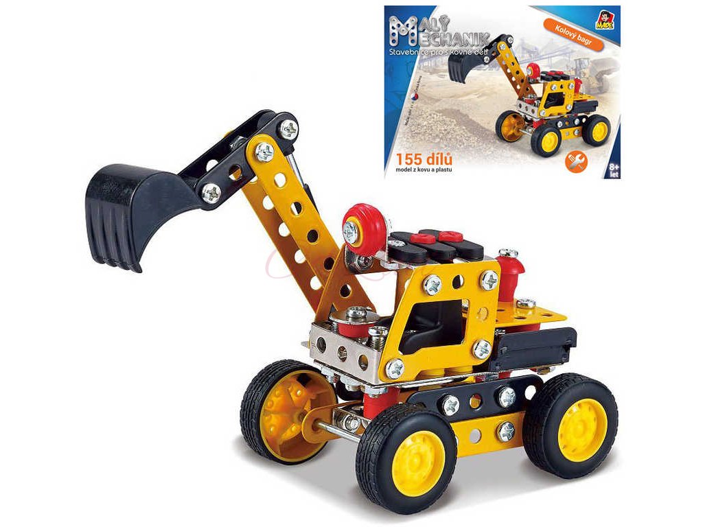 MALÝ MECHANIK Kolový bagr 155 dílků kovová STAVEBNICE typu Merkur