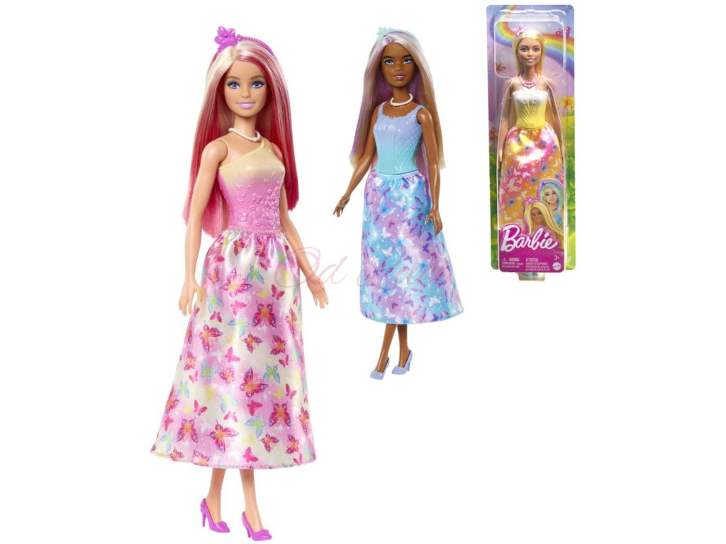 Tyto královské panenky Barbie přicházejí v duhové škále snových barev! Každá panenka má efektní melír ve vlasech, vymodelovaný živůtek, sukni s potiskem a stylové doplňky. Okouzlující a roztomilé pohádkové panenky Barbie jsou vyrobeny tak, aby inspirovaly ke kouzelným příběhům o dobrodružství - děti od 3 let je mohou sbírat všechny a užít si báječnou zábavu! Každá se prodává samostatně, podle dostupnosti. Panenky Barbie nemohou stát samostatně. Barvy a provedení dekorací se mohou lišit.