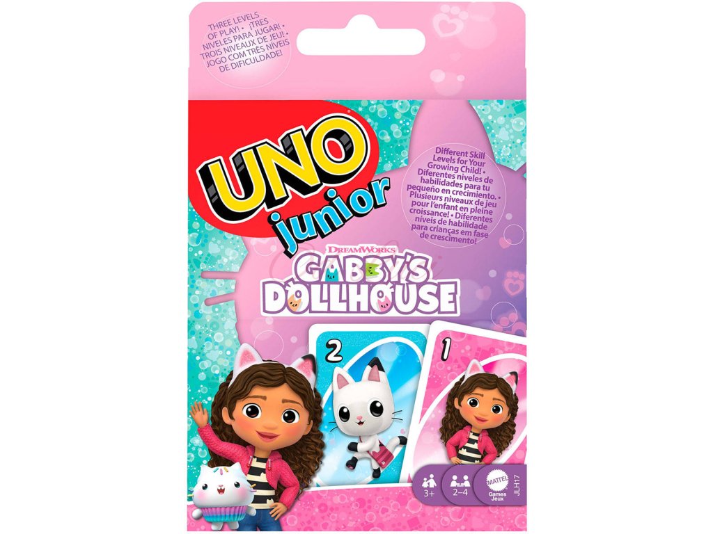 Kočičí verze oblíbené karetní hry UNO Junior s motivy postaviček z animovaného seriálu Gabby’s Dollhouse od DreamWorks přináší spoustu zábavy pro malé hráče. Hraje se podle klasických pravidel – hráči se snaží zbavit všech karet postupným přikládáním podle barvy nebo čísla. Tato edice obsahuje tři úrovně obtížnosti – začátečník, střední a pokročilý – které se přizpůsobí dovednostem dítěte. Když zbývá poslední karta, nesmí chybět výkřik „UNO!“. Speciální grafické symboly na každé kartě navíc pomáhají rozlišit barvy, takže si hru mohou užít i hráči s jakoukoli formou barvosleposti. Barvy a vzhled karet se mohou lišit.