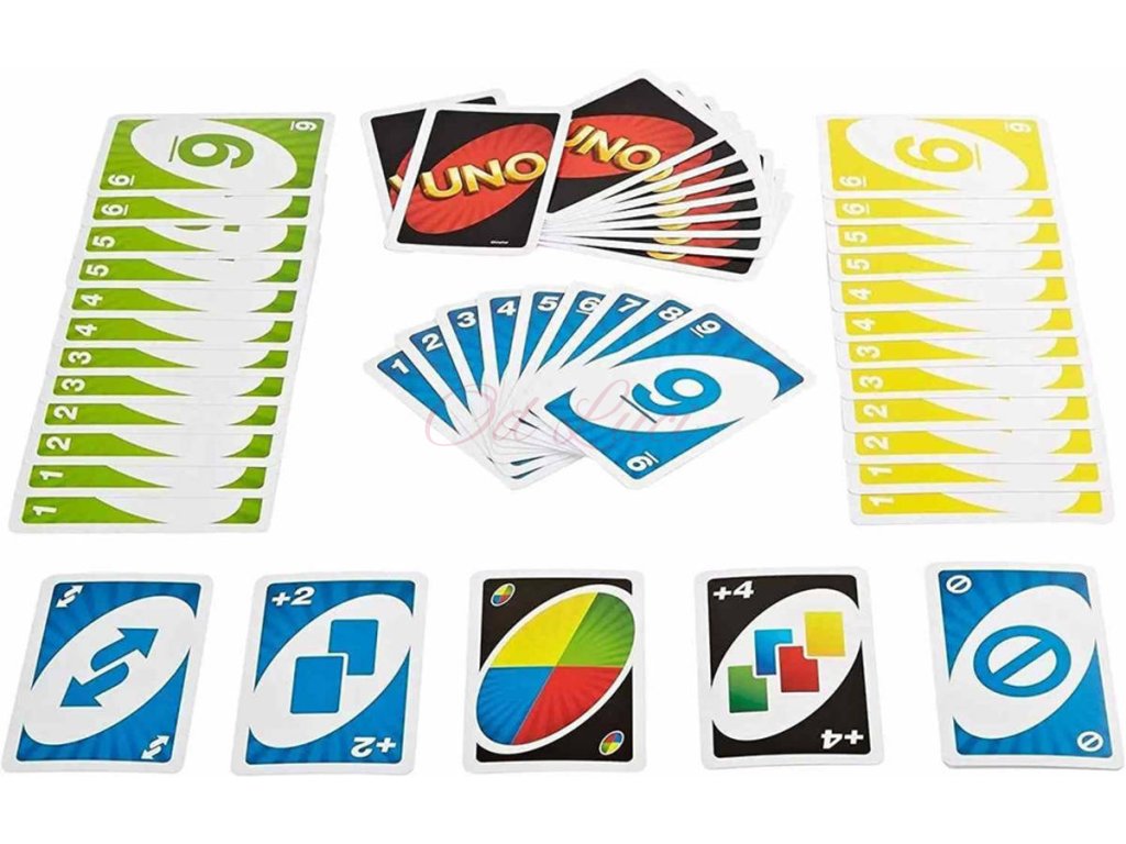 V balíčku najdeš celkem 19 karet od každé ze čtyř barev (červená, zelená, modrá a žlutá) a speciální karty: 8x Vezmi si dvě karty, 4x Změna směru (v každé barvě), 4x Přeskoč karty (v každé barvě) a společně s nimi také 4x Divoká karta, 4x Vezmi si 4 karty, 1x Vyměň si karty a 3x karty Přepiš to.