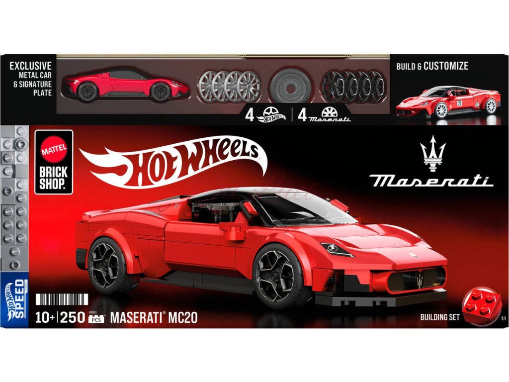 MATTEL Mega Hot Wheels auto Maserati MC20 1:32. Detailní prémiová stavebnice z kovu a plastu, součástí angličák a samolepky, 250 dílků. Velikost modelu 16,5cm