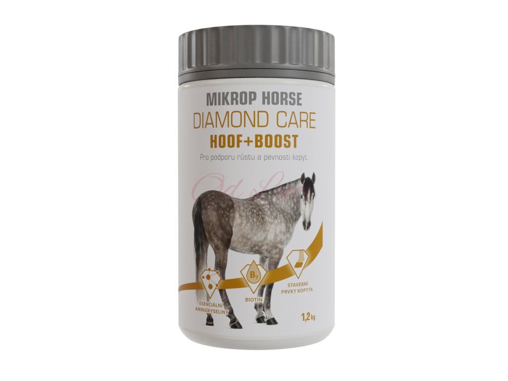 MIKROP® HORSE DIAMOND CARE HOOF+BOOST je doplňkové krmivo pro koně se zvýšeným obsahem biotinu, zinku a esenciálních aminokyselin pro podporu růstu a vitality kopytní rohoviny.