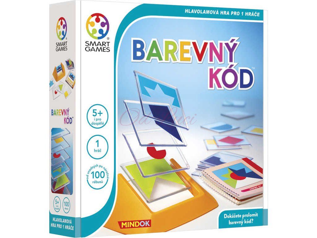 Hlavolamová hra pro 1 hráče z řady SMART games. Dílek po dílku a obrázek je tu! Barevný kód přináší explozi barevné zábavy pro děti i dospělé. 100 Různých rébusů zadání vám přinese zajímavé výzvy a celé dny zábavně stráveného času. Využijte 18 průhledných destiček s různobarevnými tvary k vytvoření obrázku ze zadání. Zdá se vám to jednoduché? Možná na začátku, ale postupně se rébusy stávají velkou výzvou pro každého. Důležitý není pouze správný výběr destiček, ale také jejich správné natočení a pořadí, ve kterém je na sebe umístíte. Dokážete prolomit barevný kód?