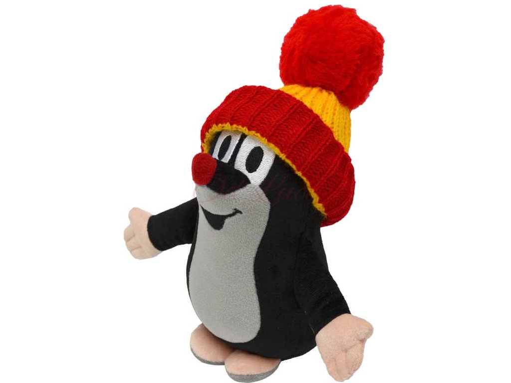 Plyšový Krteček se sundavací čepicí, ve spodní části je naplněn fazolkami, rozvíjející hmatové schopnosti dítěte. Červeno-žlutá čepice.