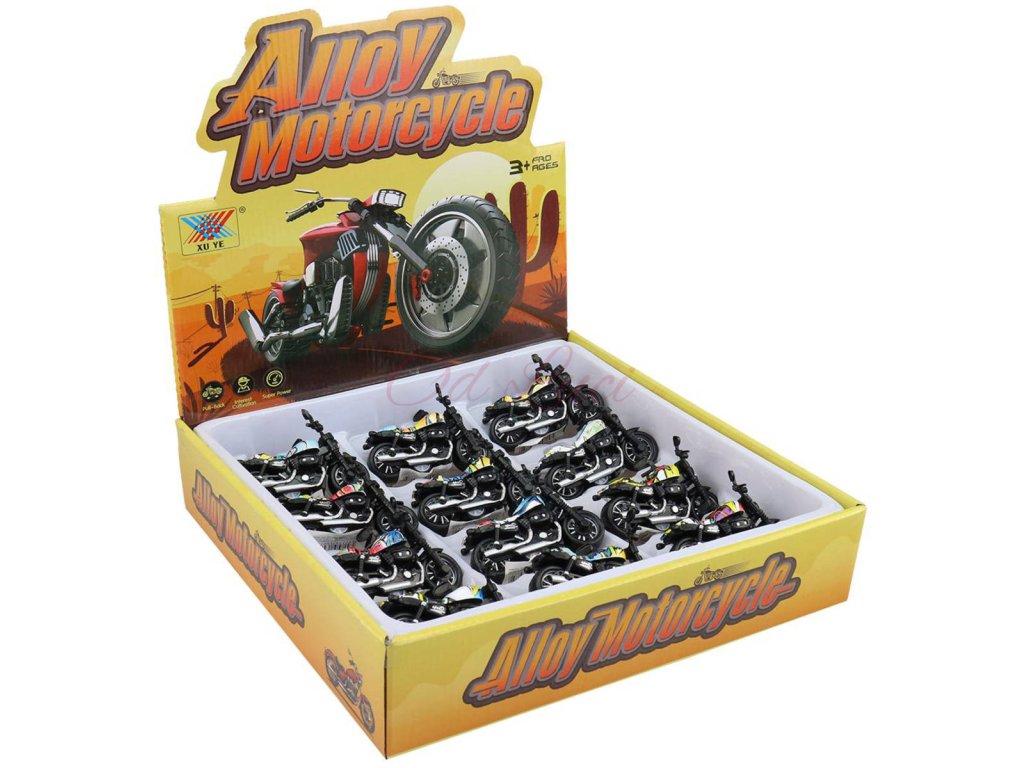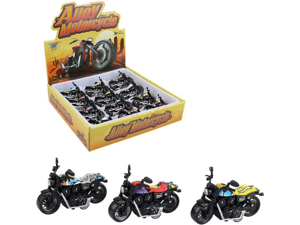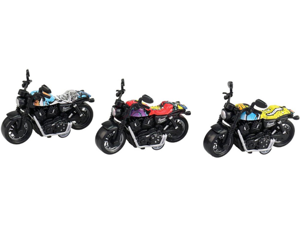 Silniční černý cestovní motocykl s pohonem na zpětné natažení (malá kolečka), plastová motorka, široké pneu, pro všechny malé motorkáře. 3 barevné varianty s grafikou.