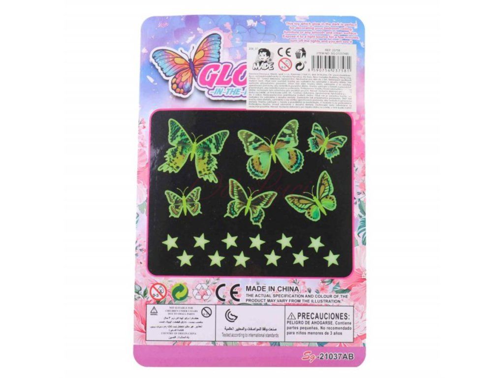 Fluorescenční samolepky Motýli a hvězdičky – svítící ozdoby, dekorace na stěnu, do dětského pokoje! Svítí ve tmě (fosforeskuje). Součástí štítky k nalepení.